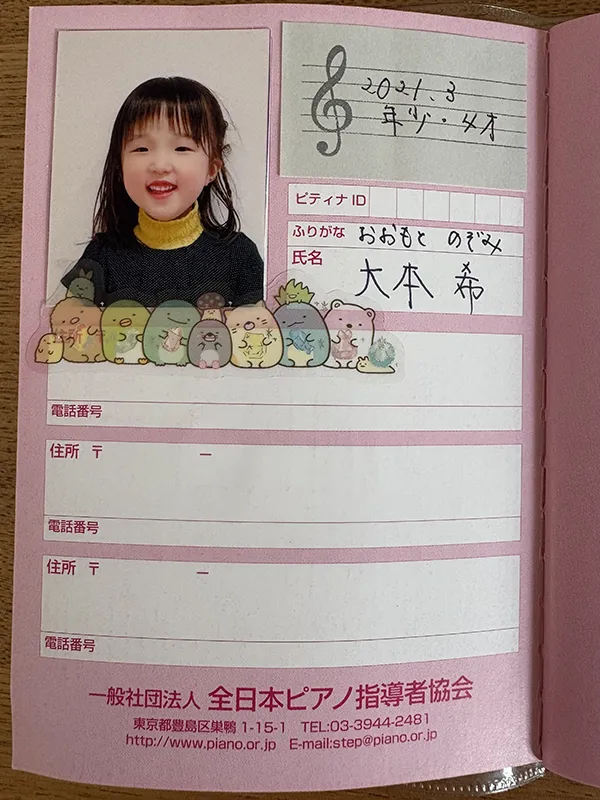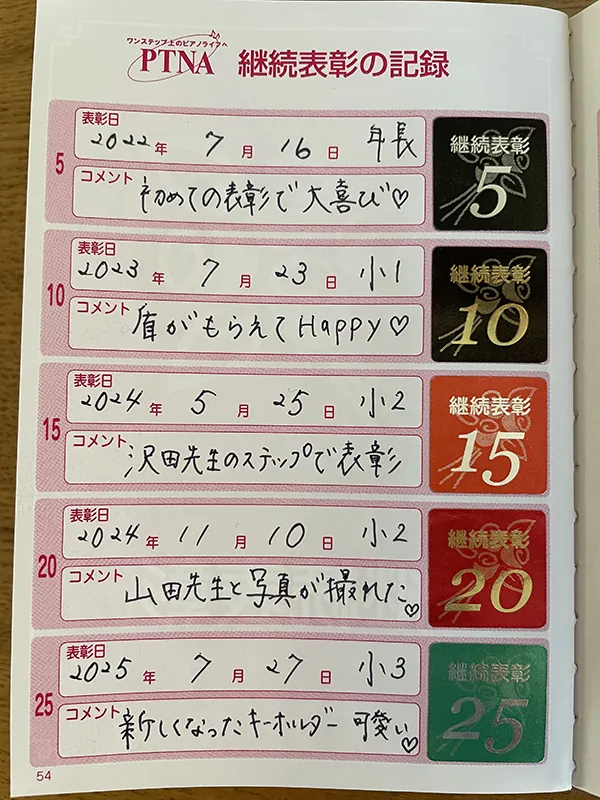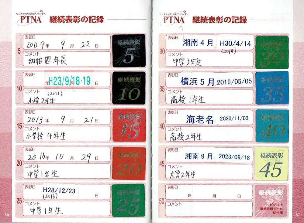 小学生の頃は、クラシックだけでなくアニメジャズや洋楽ポップスも選曲していました。導入、基礎、応用の合格シールをいただくことが嬉しかったです。また、友人と連弾にも挑戦し、一緒に曲を作っていく楽しさを知りました。