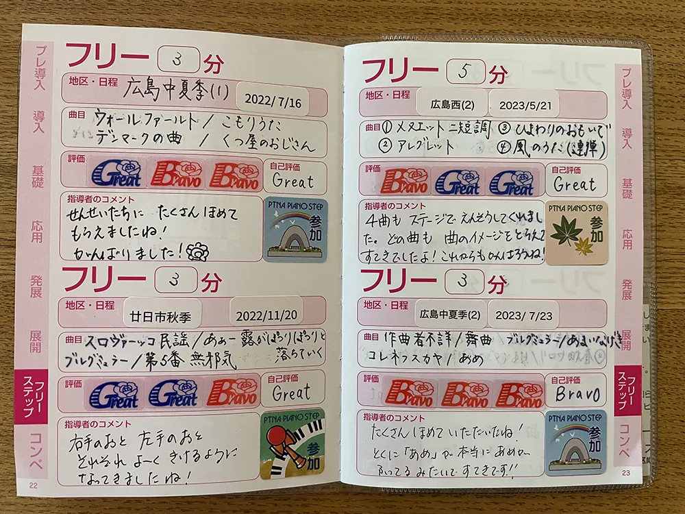 中学生になると長い曲を弾きたくなり、またコンペ課題曲の予行演習のためにフリーステップが多くなりました。アドバイザーの先生からのメッセージを読み込みながら練習を重ねたことを思い出します。