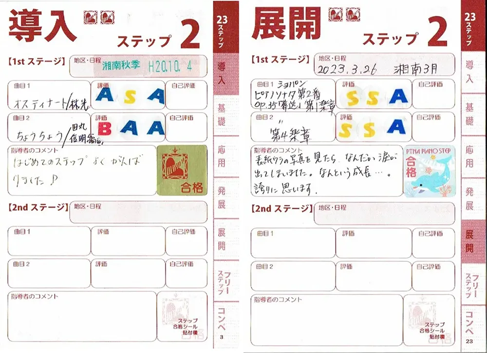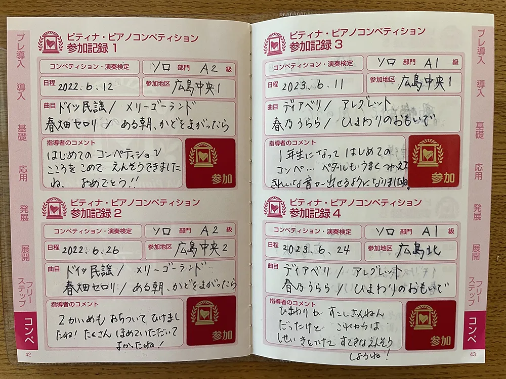 演奏した曲目、自己評価を記録しましょう。「指導者のコメント」欄は先生からのコメントはもちろん、ご家族のコメントを書いてもOKです。中には、その日ひいたピアノ機種を記録している方もいます。