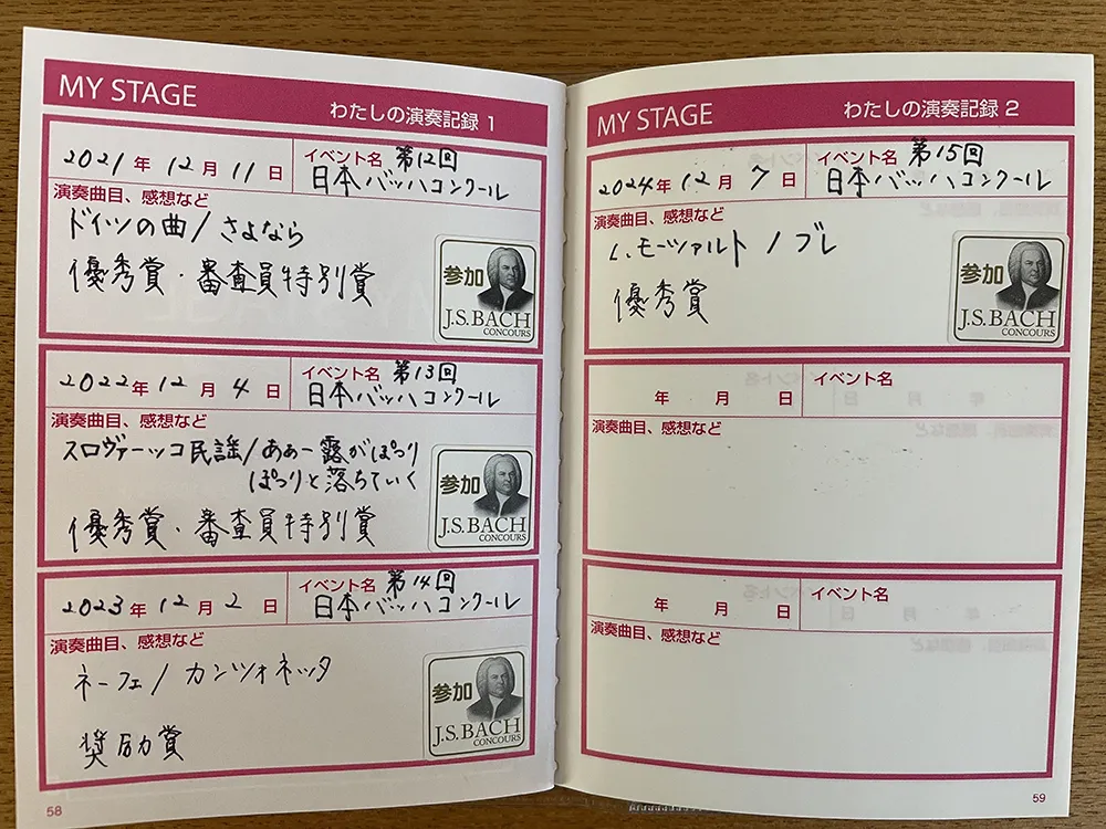 どんな演奏経験も自由に記せるMy Stageのページ。発表会や合唱コンクールでの演奏、家族や友達の結婚式での演奏など、なんでも書き込めます。提携コンクールのシールを貼ってもOKです。