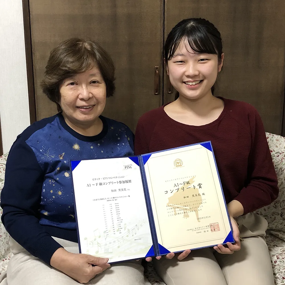 コンペでは、A2級からG級、Yカテゴリーに参加し、「コンプリート賞」の表彰式に出席させていただきました。4歳からご指導いただいている金子彩子先生は、曲の持つイメージを考え、色々な音色を探していくレッスンで、成長過程に合わせて導いてくださいました。先生と一緒に一歩ずつ進んできたことが「コンプリート賞」という形に残せたことをとてもうれしく思っています。