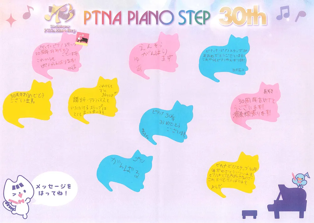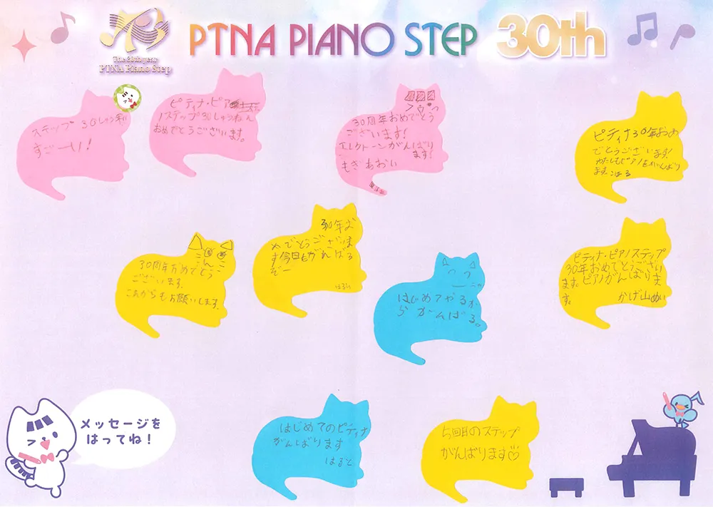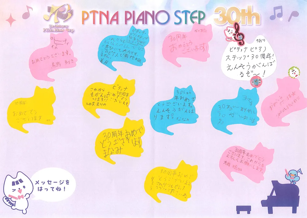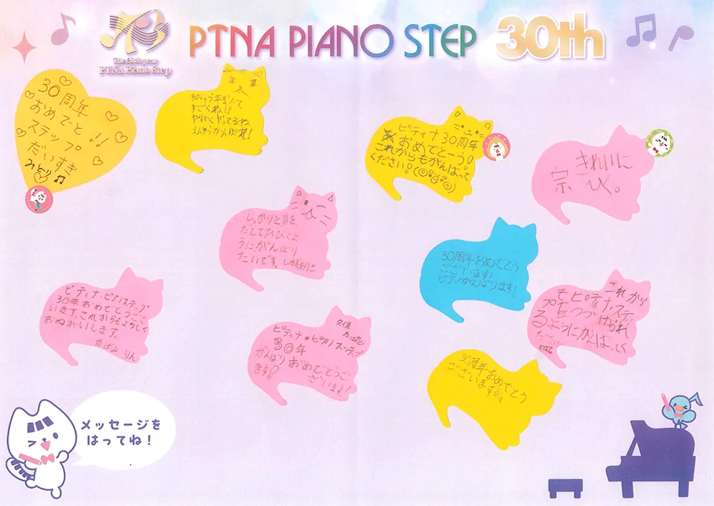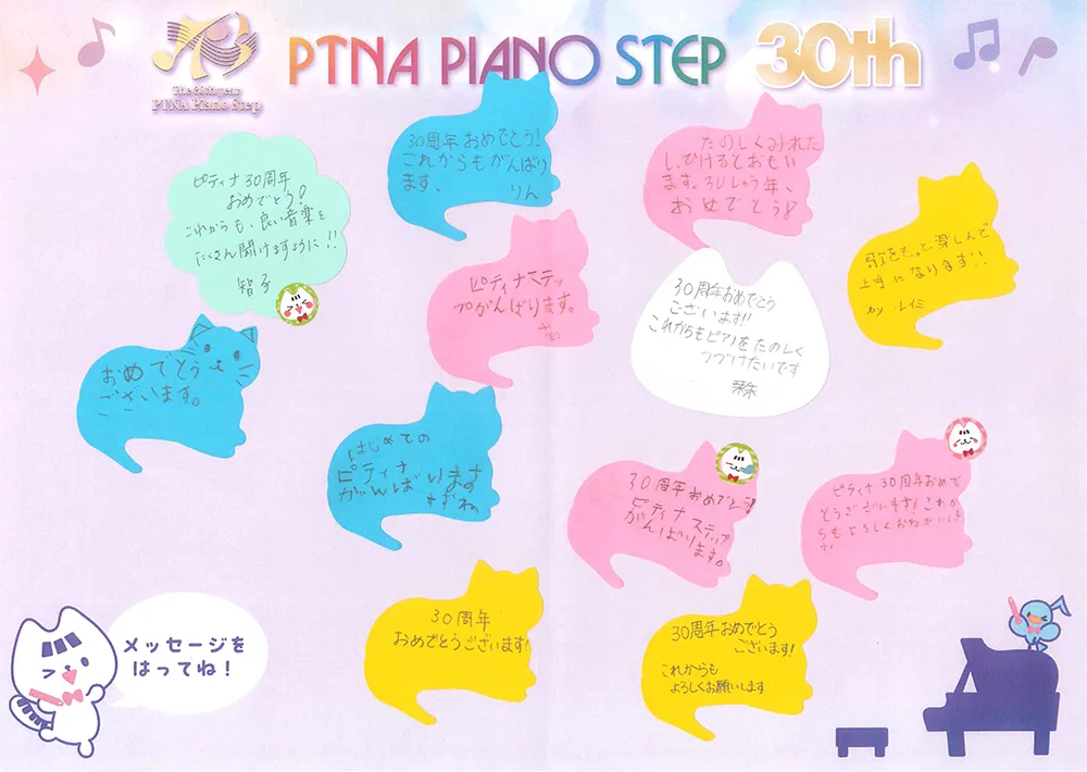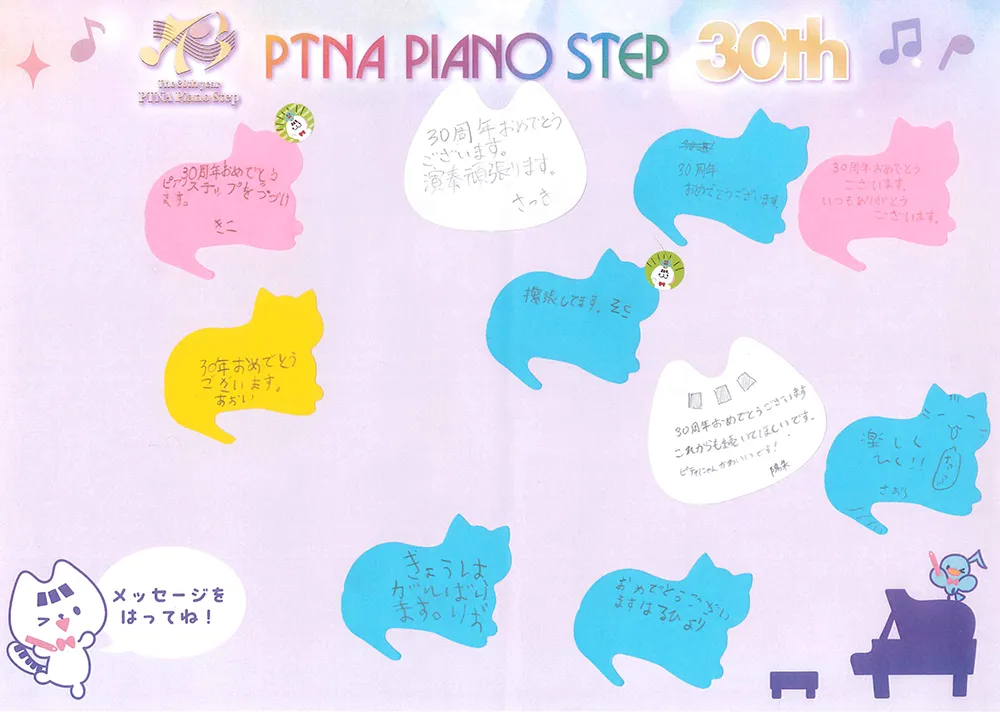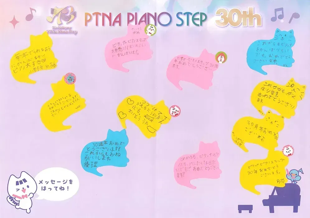 ステップ30年 寄せ書き:千歳 2026/04/22公開 Tweet 1996年にスタートしたピティナ・ピアノステップは、今年で30年目を迎えました。この記念すべき年を祝し、全国のステップ会場をつなぐ寄せ書き企画を実施いたします! 千歳 開催 2026年4月5日(日) 開催 千歳はすかっぷステーション 会場 千歳市民文化センター(北ガス文化ホール)中ホール 寄せ書き一覧 参加方法