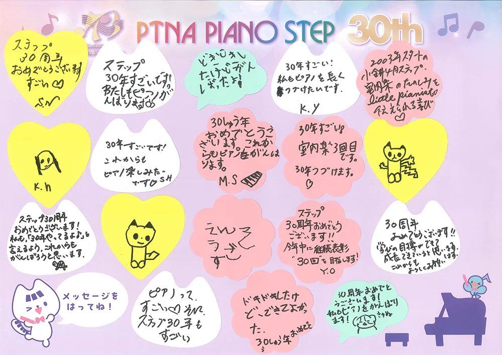 ステップ30年 寄せ書き:小金井4月 2026/04/22公開 Tweet 1996年にスタートしたピティナ・ピアノステップは、今年で30年目を迎えました。この記念すべき年を祝し、全国のステップ会場をつなぐ寄せ書き企画を実施いたします! 小金井4月 開催 2026年4月5日(日) 開催 多摩川ステーション 会場 宮地楽器 小金井店さくらホール 寄せ書き一覧 参加方法