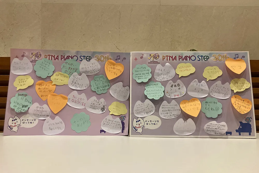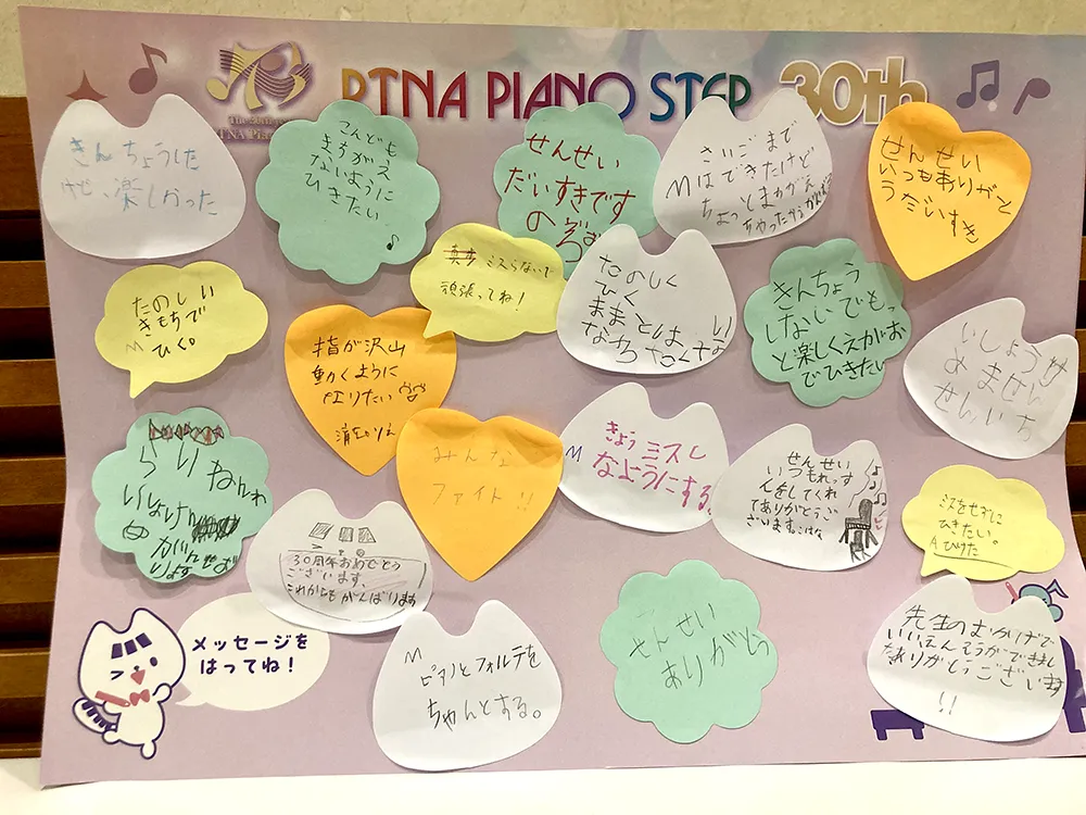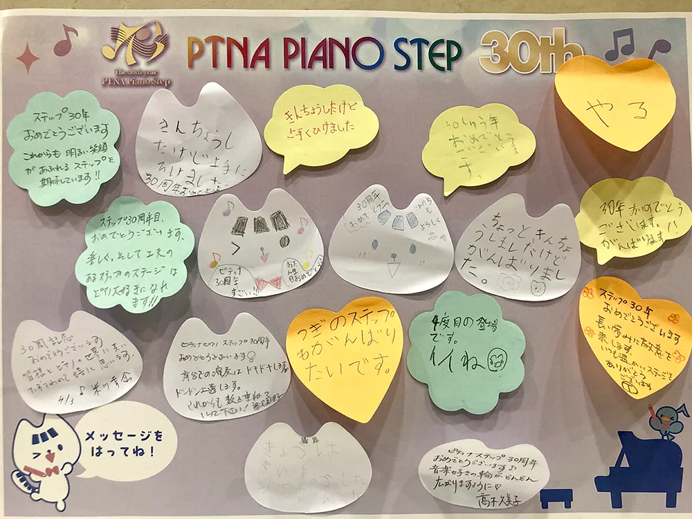 ステップ30年 寄せ書き:大泉学園春季 2026/04/16公開 Tweet 1996年にスタートしたピティナ・ピアノステップは、今年で30年目を迎えました。この記念すべき年を祝し、全国のステップ会場をつなぐ寄せ書き企画を実施いたします! 大泉学園春季地区 開催 2026年4月3日(金・祝) 実施事務局 大泉学園アルモニカステーション 会場 大泉学園ゆめりあホール 寄せ書き一覧 参加方法