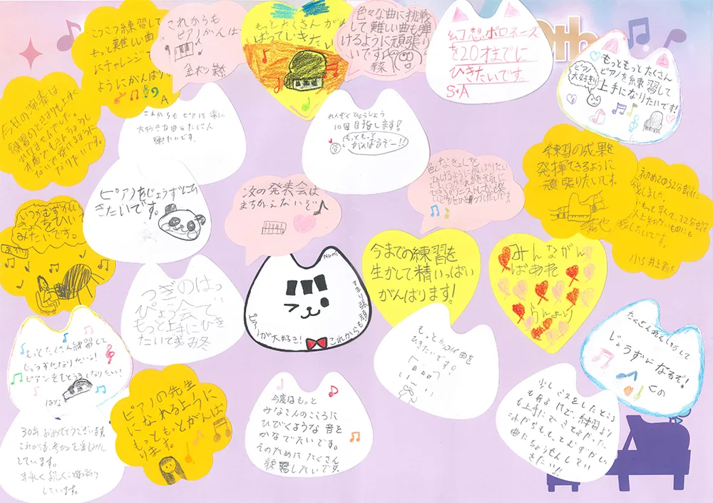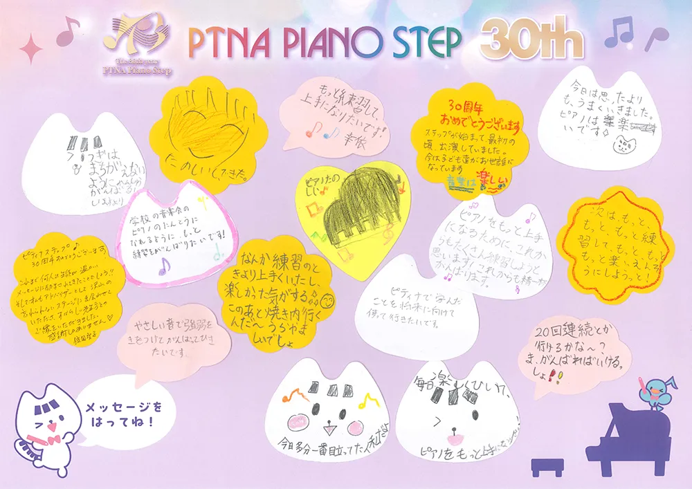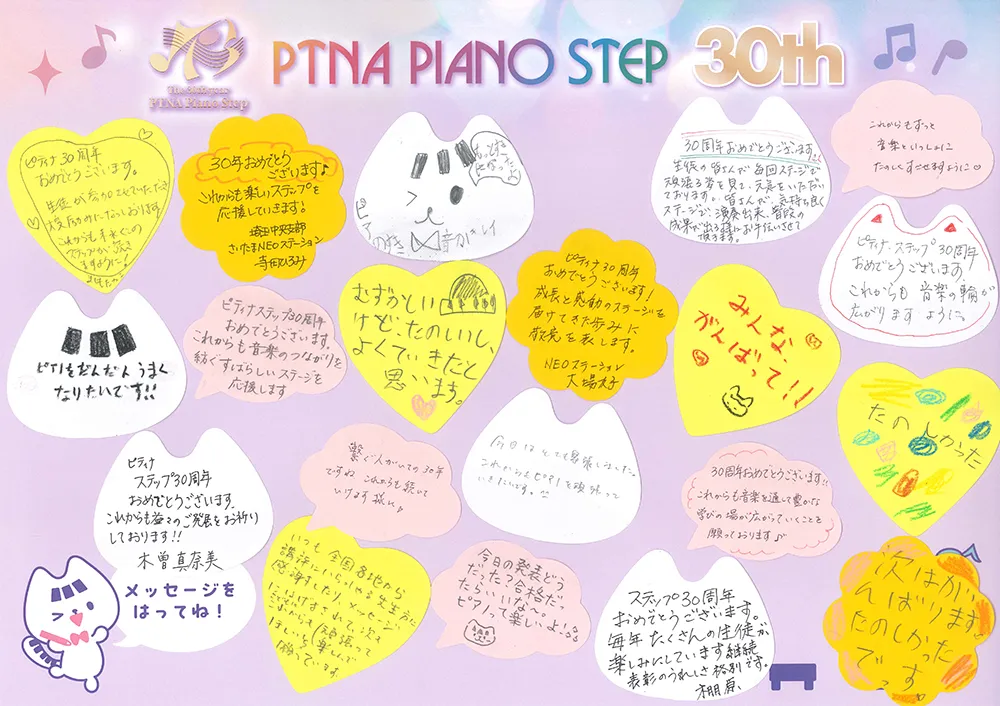 ステップ30年 寄せ書き:さいたま4月 2026/04/22公開 Tweet 1996年にスタートしたピティナ・ピアノステップは、今年で30年目を迎えました。この記念すべき年を祝し、全国のステップ会場をつなぐ寄せ書き企画を実施いたします! さいたま4月 開催 2026年4月19日(日) 開催 さいたまNEOステーション 会場 さいたま市産業文化センター 寄せ書き一覧 参加方法