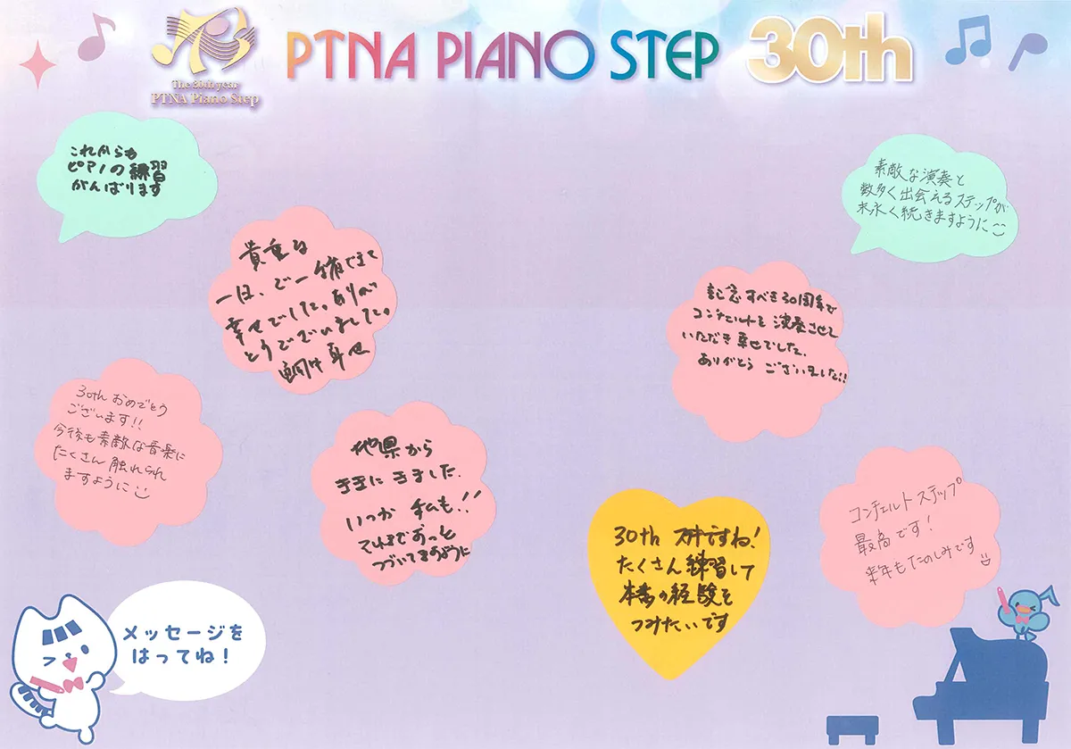ステップ30年 寄せ書き:新百合ヶ丘コンチェルト 2026/04/16公開 Tweet 1996年にスタートしたピティナ・ピアノステップは、今年で30年目を迎えました。この記念すべき年を祝し、全国のステップ会場をつなぐ寄せ書き企画を実施いたします! 新百合ヶ丘コンチェルト 開催 2026年4月5日(日) 開催 文京アナリーゼステーション 会場 昭和音楽大学 ユリホール 寄せ書き一覧 参加方法