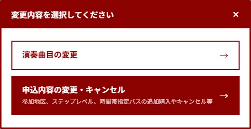 - 参加料金の変更を伴う申込変更をしたい方(ステップレベルの変更、時間帯指定パスの追加購入、申込のキャンセル)